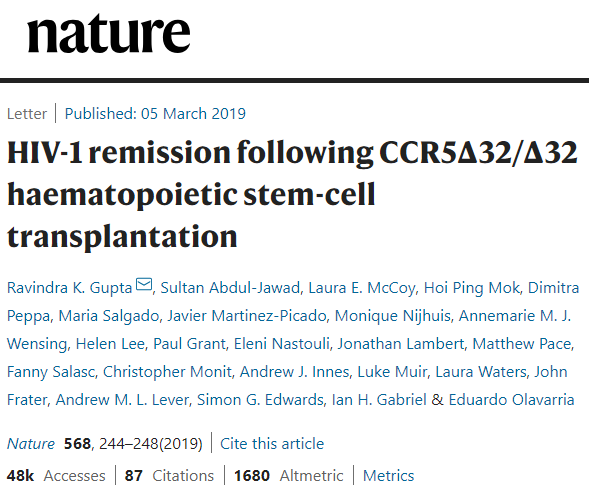 2020年3月10日,Ravindra K. Gupta 团队在 Lancet HIV 发表了题为 Evidence for HIV-1 cure after CCR5Δ32/Δ32 allogeneic haemopoietic stem-cell transplantation 30 months post analytical treatment interruption: a case report 的研究,报道了那位神奇的「伦敦病人」治疗的最新进展。